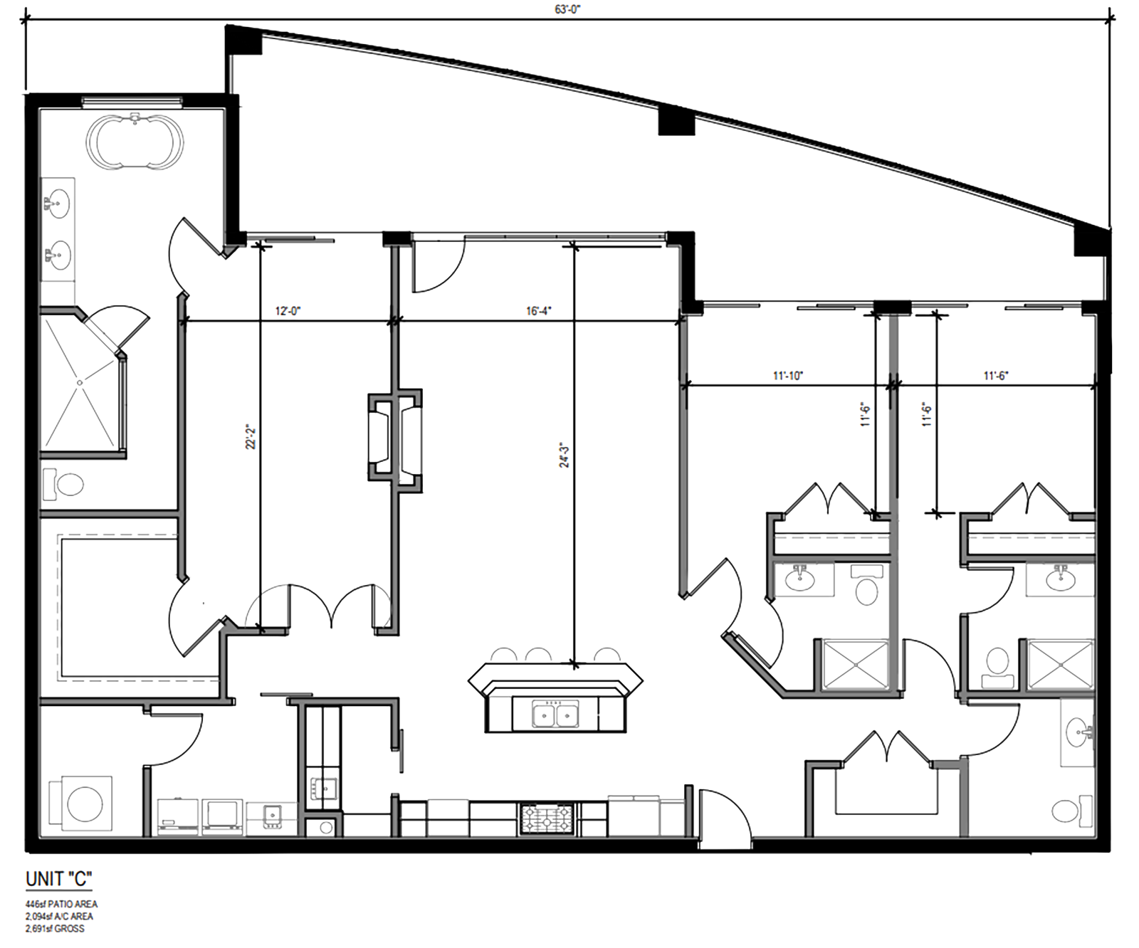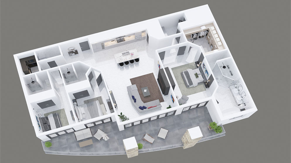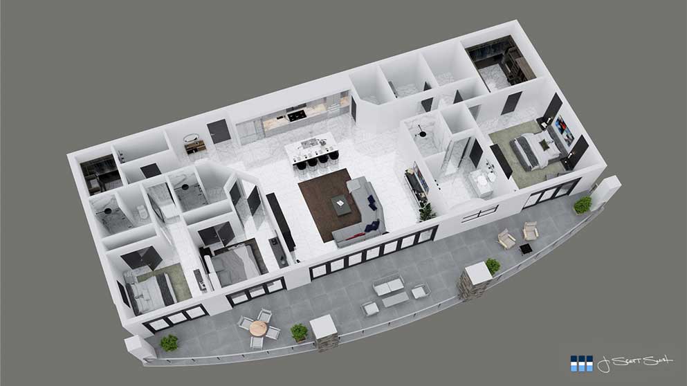 The Diamond features 3 bedroom, 3 ½ bath 2,094 sq. ft. indoor living space with 446 sq. ft. of outdoor living space. The split bedroom open floor layout offers added privacy for owner and guests, but at the same time, it is perfect for entertaining and gathering with family and friends. All bedrooms are en suites with direct access to the covered terrace that offers great waterfront views. The covered terrace helps bring the outdoors in with the large panoramic sliding glass doors, while oversized island kitchen, generous master suite with walk-in closet, 10 ft. high ceilings, fireplace, high-end finishes and Thermador appliances round out the list of features.